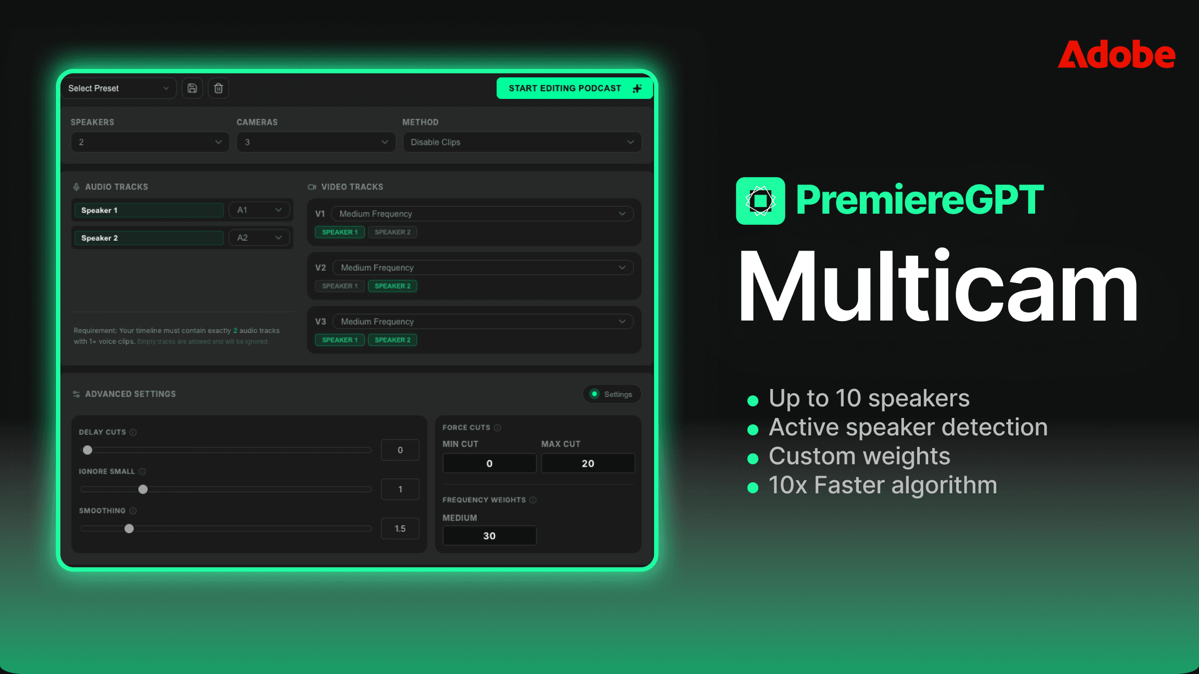 You know the drill. You've got six camera angles, a dedicated audio track from the mixer, and a producer who wants a first cut by end of day. You drop everything into a sequence, create a multicam clip, and then you sit there — manually scrubbing, manually cutting, manually babysitting every speaker transition like it's 2009.
